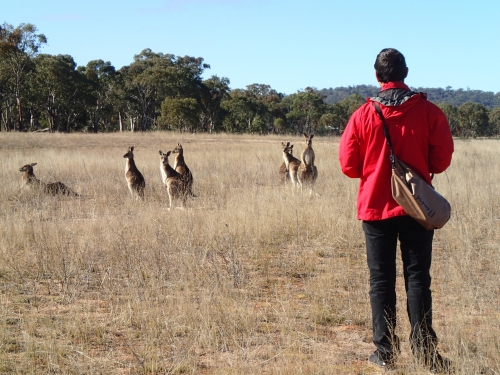 Ich sitze gerade in einem Campingstuhl blicke auf einen großen See der umschlossen ist von brauner Graslandschaft die übergeht in dunkelgrüne Eukalyptuswälder. Am gegenüberliegenden Ufer ziehen Kuhherden zum Tränken ans Wasser. Die weissen Häufchenwolken spiegeln sich im See und ein Känguruh liegt wenige Meter von mir entfernt im Gras.
